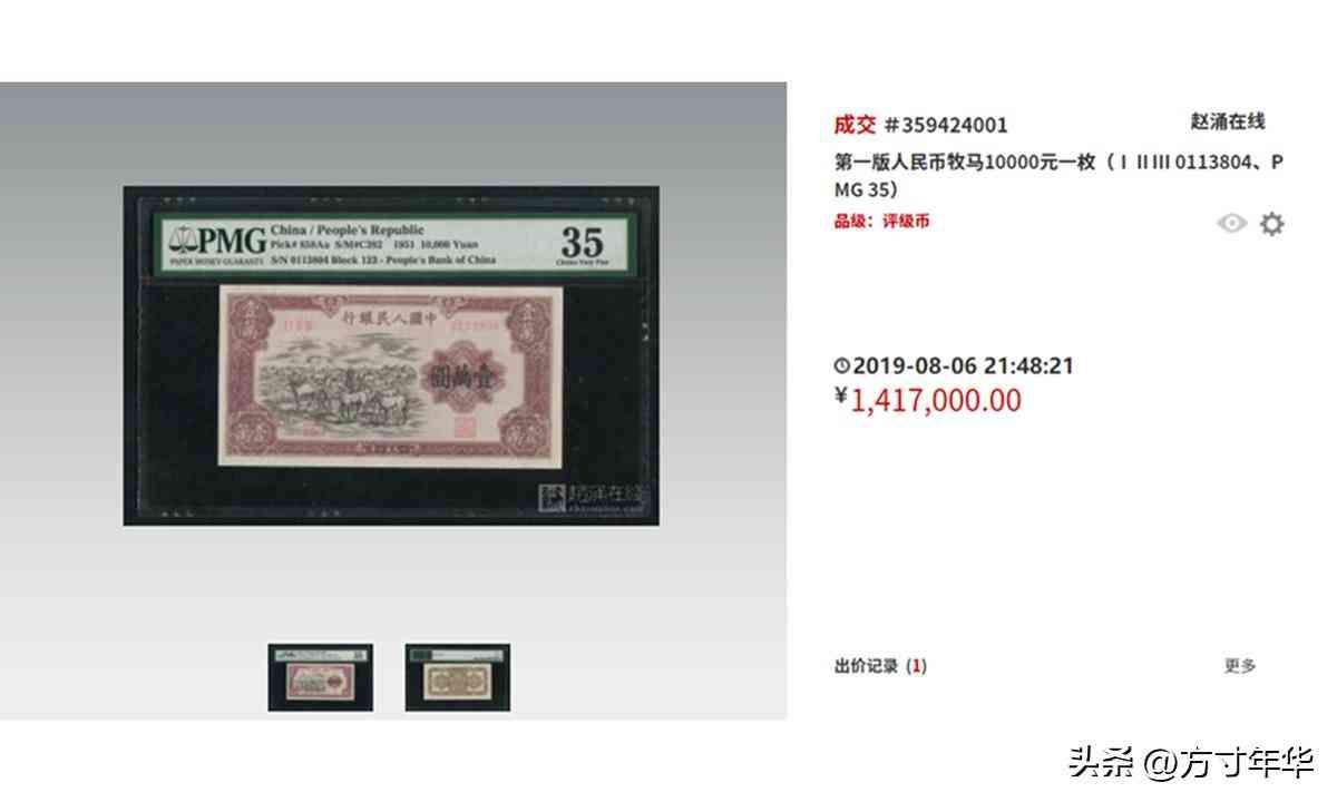 紧随其后就是这枚一版币牧马1元,19年8月成交,成交价接近142万的高价!能有如此之高价,原因就在于一版币牧马发行时间极短,从发行到停止流通前后也不过3年11月,而后面无论是保存手段、印刷质量,还是保存意识、旧币回收等因素,使得目前一版币中的牧马图的存世量很少见。