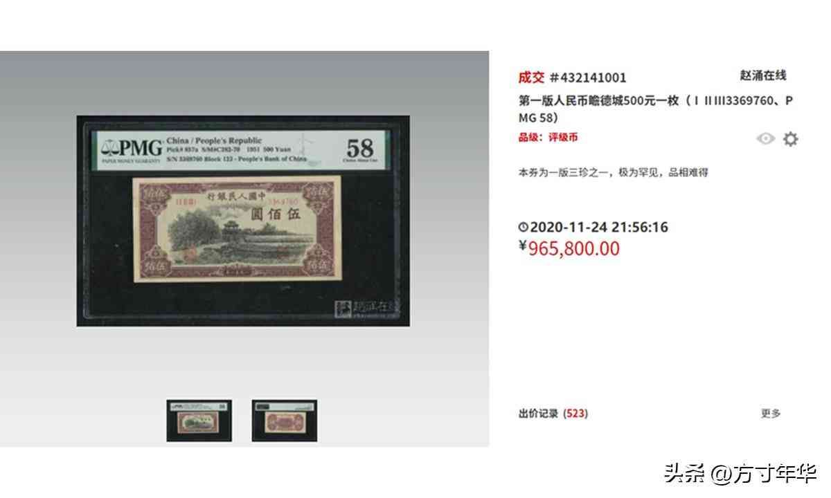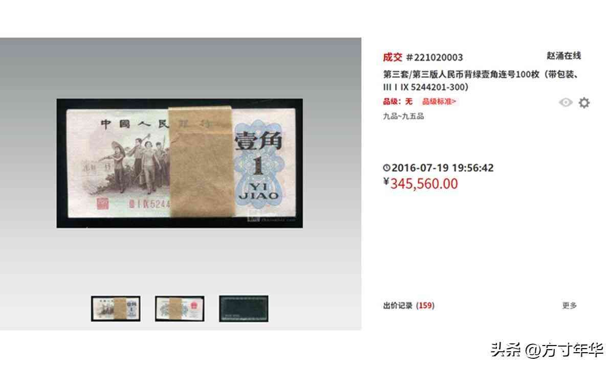 看完了一版币和二版币的收藏价值,再来看看三版币!16年7月成交的三版币一角背绿,1连号,34.5万成交!记录超过159轮!