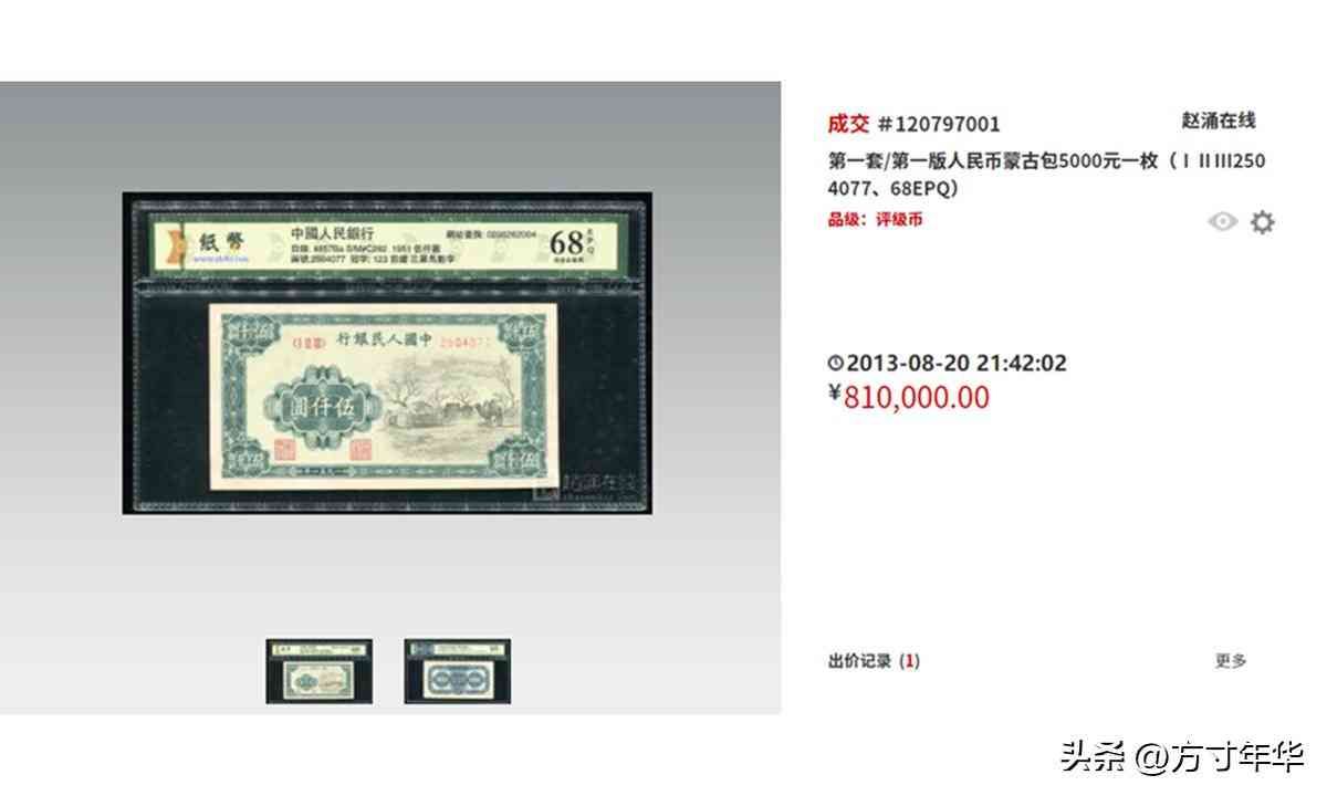 还有68分带E的蒙古包,在13年的时候以81万成交!跟其他一版币稀少的原因一样,面值大,保存难度大,回收彻底,这也导致了一版币的实际收藏价值普遍偏高!