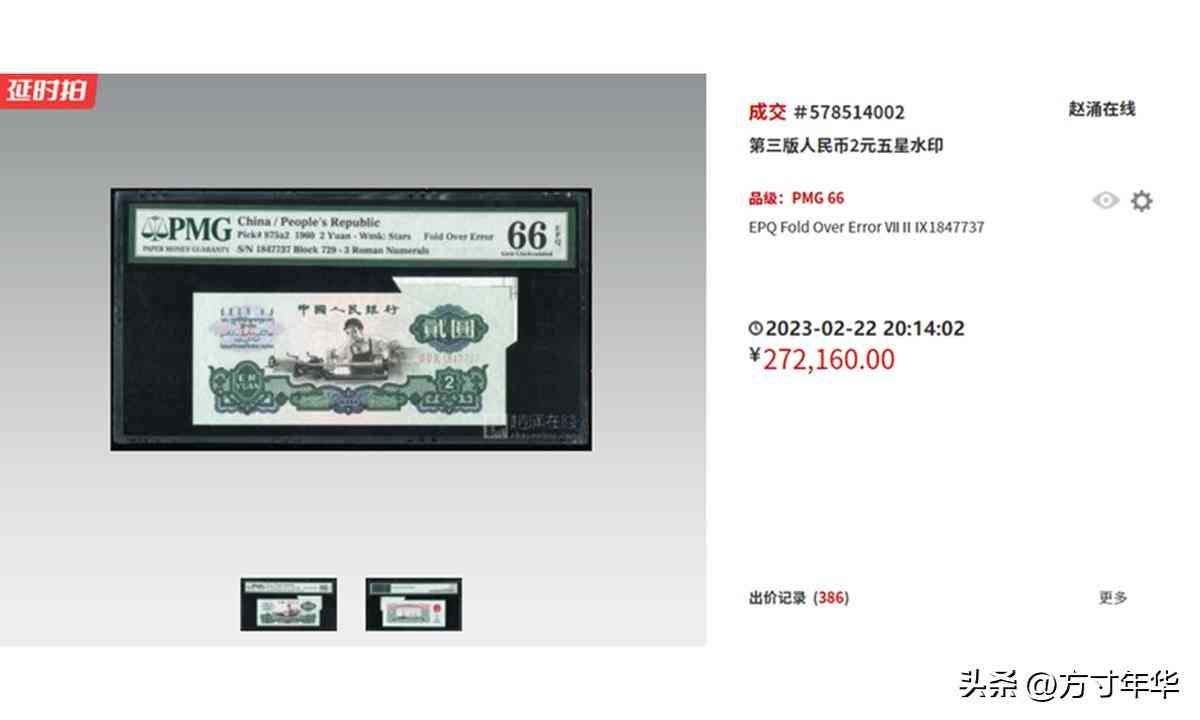 还有这枚三版币,66分带E的2元五星水印,同时还带有Fold Over Error,在23年2月以27.2万的高价成交!