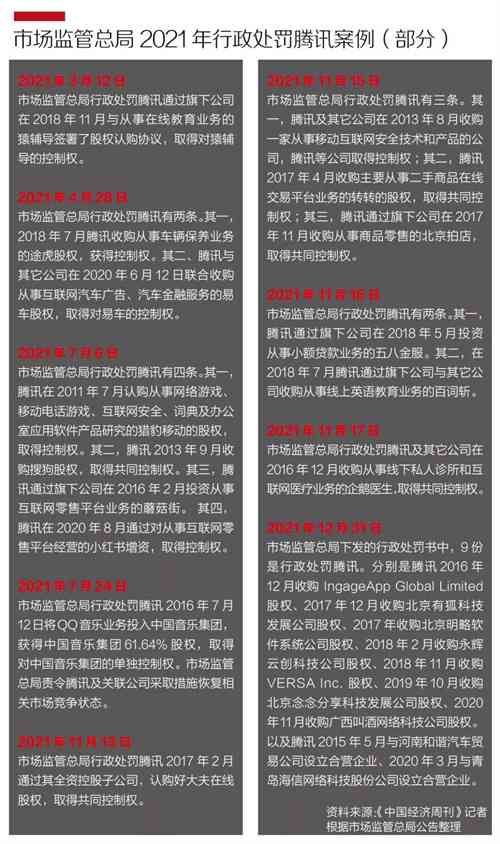 1月5日,市场监管总局公布了13起行政处罚案例,其中9起涉及腾讯。更早前,2021年11月20日,市场监管总局公布了43起行政处罚案例,其中13起涉及腾讯。这些处罚案例多与投资并购案有关,处罚原因是“未依法申报违法实施经营者集中”。