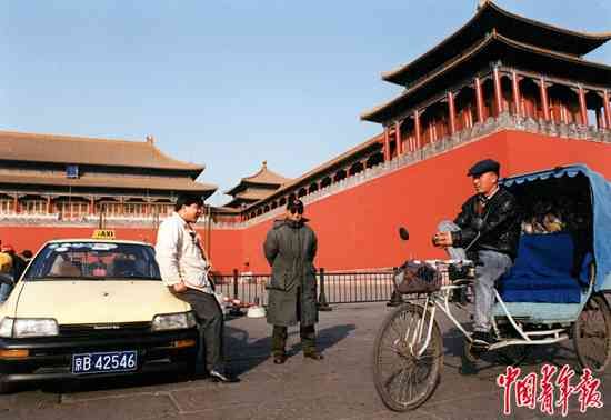 上世纪90年代,北京故宫午门外广场,等待客人的出租车司机和三轮车车夫。中青报·中青网记者 李建泉/摄