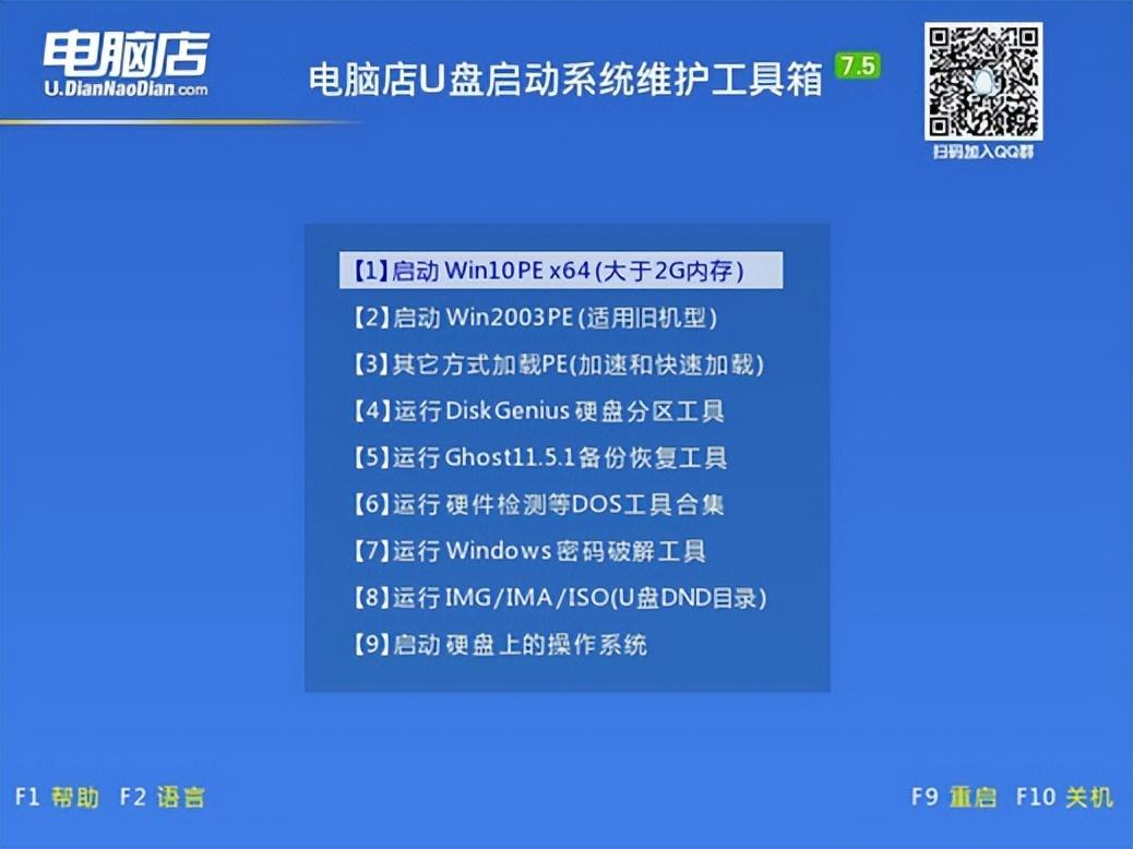 3、电脑会进入电脑店winpe主菜单,选择【1】然后按回车。