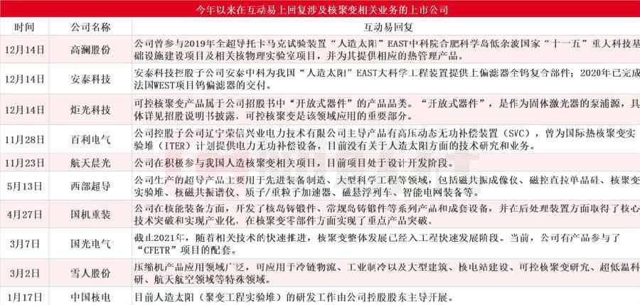 据财联社不完全统计,今年以来多家上市公司纷纷在互动易上披露核聚变相关业务研发情况,涉及公司包括高澜股份、安泰科技、炬光科技、百利电气、航天晨光、西部超导、国机重装、国光电气、雪人股份、中国核电等。
