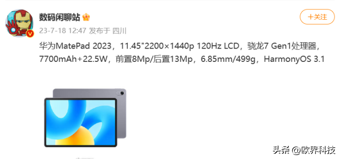 欧界科技7月18日消息:今日华为官微正式宣布新款平板MatePad 2023将于7月20日19:发布,官方宣传词“柔光入眼更护眼,学习阅读新体验”。