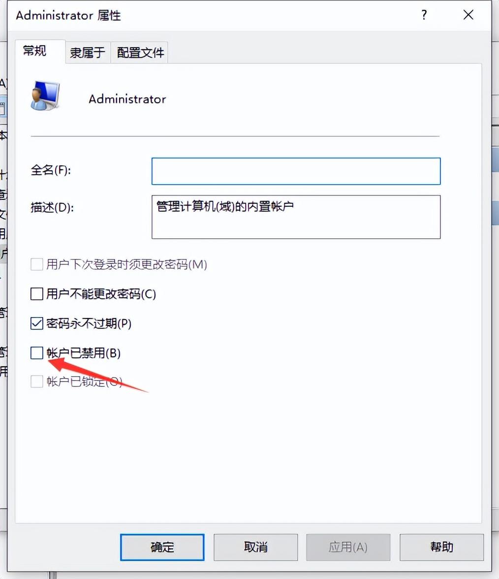 3、在打开的界面中,取消勾选账户已禁止即可,这样就能使用管理员账户去打开相应的文件或者程序了。