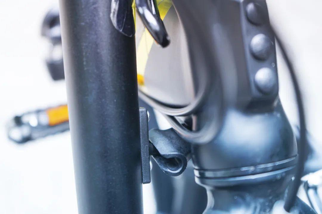 在头管的中间位置有个可活动的塑料小配件,一开始我无法理解它的功能。直到某天我将PKA015折叠起来之后,发现它可以很好地和车架右侧的另一个塑料卡扣进行对接固定。