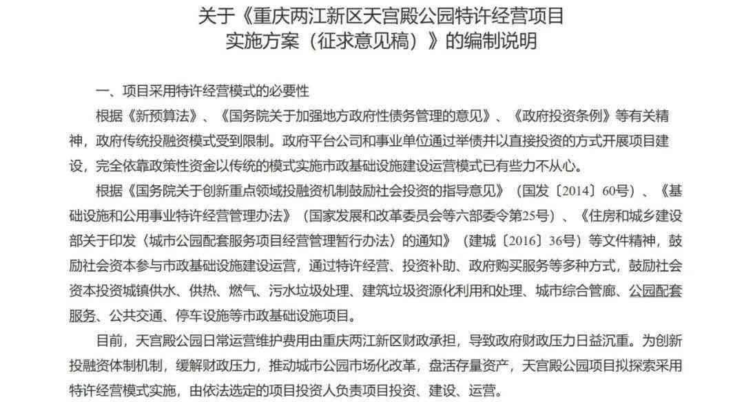 黄桷树财经注意到,上述公告透露,目前山地运动公园、天宫殿公园日常运营维护费用由重庆两江新区财政承担,导致政府财政压力日益沉重。为创新投融资体制机制,缓解财政压力,推动城市公园市场化改革,盘活存量资产,山地运动公园、天宫殿公园项目拟探索采用特许经营模式实施,由依法选定的项目投资人负责项目投资、建设、运营。