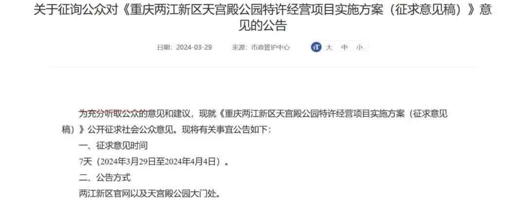2024年3月29日,重庆两江新区管委会官网刊登的2则征集意见公告透露,两江新区山地运动公园和天宫殿公园拟实施特许经营运作,征集意见的时间为2024年3月29日至4月4日。