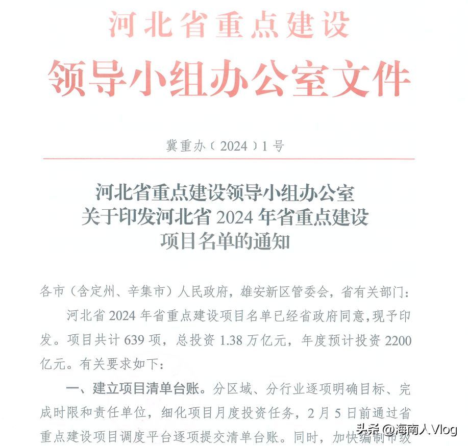 近期河北省政府发布有关于2024年重点建设项目清单,639个项目,其中年内投资2200亿元,涉及到学校、医院、农业、产业园、半导体产业、新能源材料、通信产业、公路、铁路、生态保护等多个领域多行业。