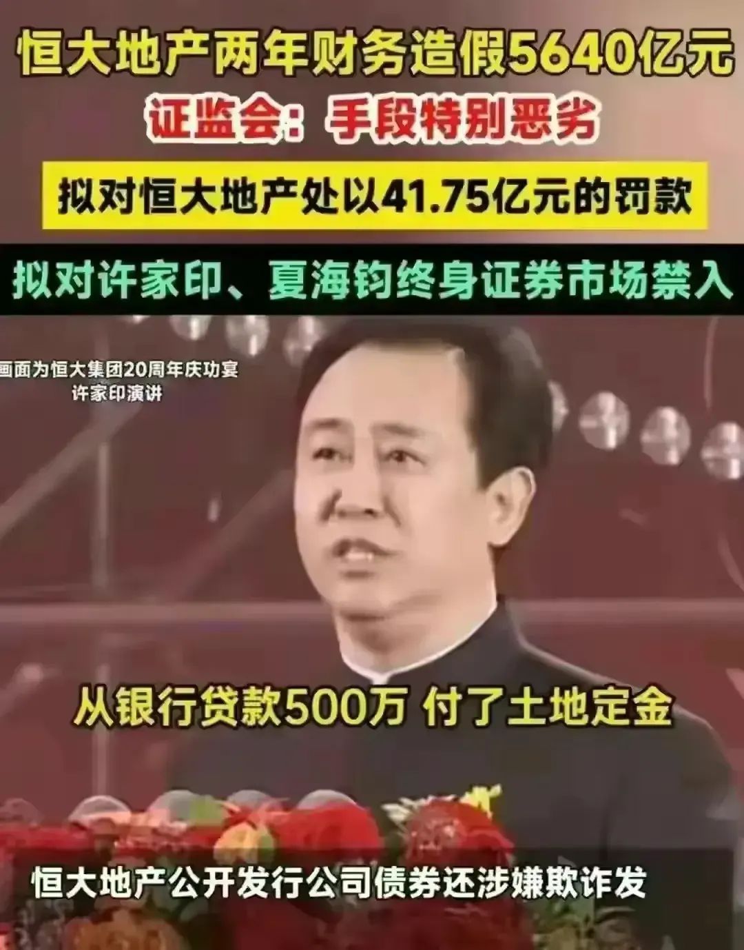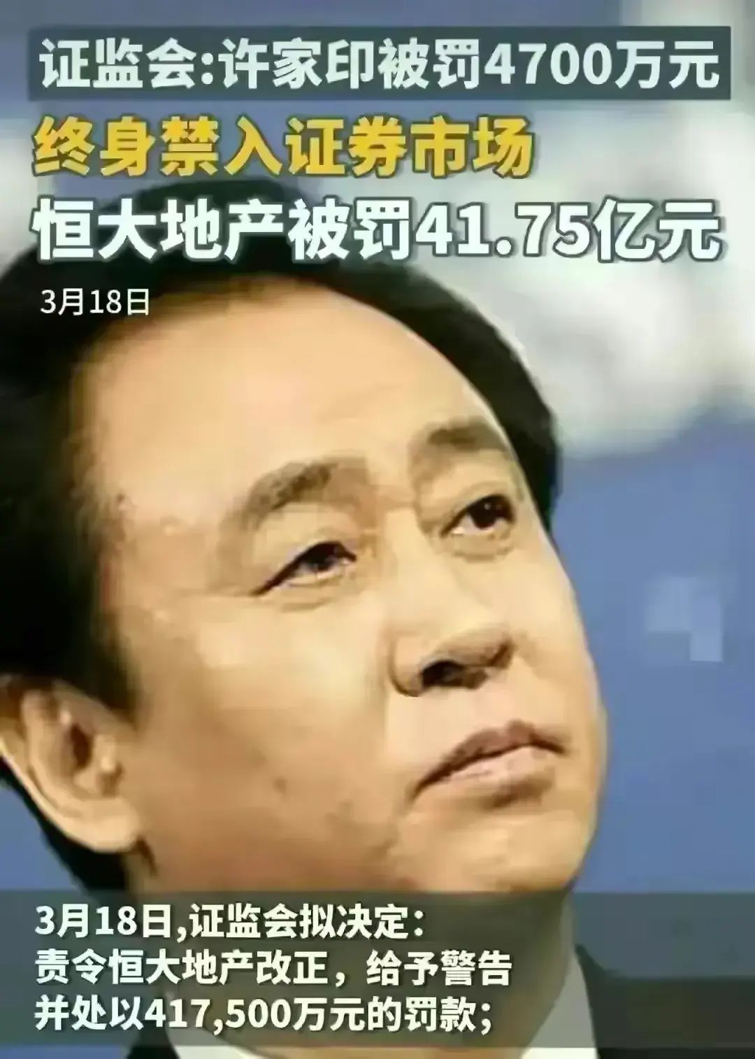 3月18号,证监会作出决决定,令恒大集团改正里面的错误决定,给警告,出罚金41多亿,许家印罚款4700万,终身禁入交易债券市场,他出不出来都是一回事呀?为什么要做出这种处罚?是有意思,要把它放出来吗?这个是个人猜测不清楚,而是有关部门在考虑问题?