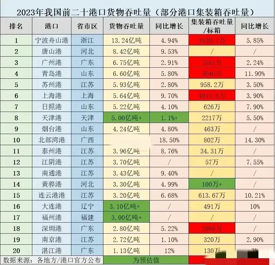 2023年,根据货物吞吐量来看,宁波舟山港已经跃居全国第一大港,实现货物吞吐量13.24亿吨,增长百分之4.94;在集装箱吞吐量方面,宁波舟山港实现吞吐量3530.1万标箱,少于上海港,居第2位。