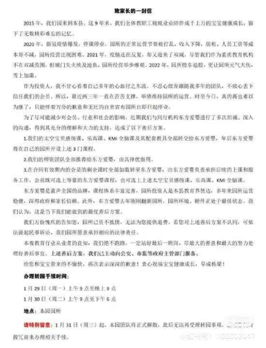 在通告中,该机构表示,自2020年以来,机构的正常运营节奏被打乱,收入下降,房租、人员工资等成本却不减,园所经营出现困难,到了2022年,园所股东退股。近年来运营人举债维持园所的运营,而今难以为继。