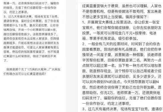 在社交平台上,有家长爆料称,红黄蓝机构重营销大于教育,其会组织萌宝大赛让家长为孩子进行线上投票,获奖选手可以得千元现金以及苹果手机等奖品。而后其会让家长预存现金来增加票数,现金可以未来上课使用,也可以介绍亲朋好友买课,机构再相应退还,还可以另外得到5%的返点。这样的营销套路令不少家长感到反感。