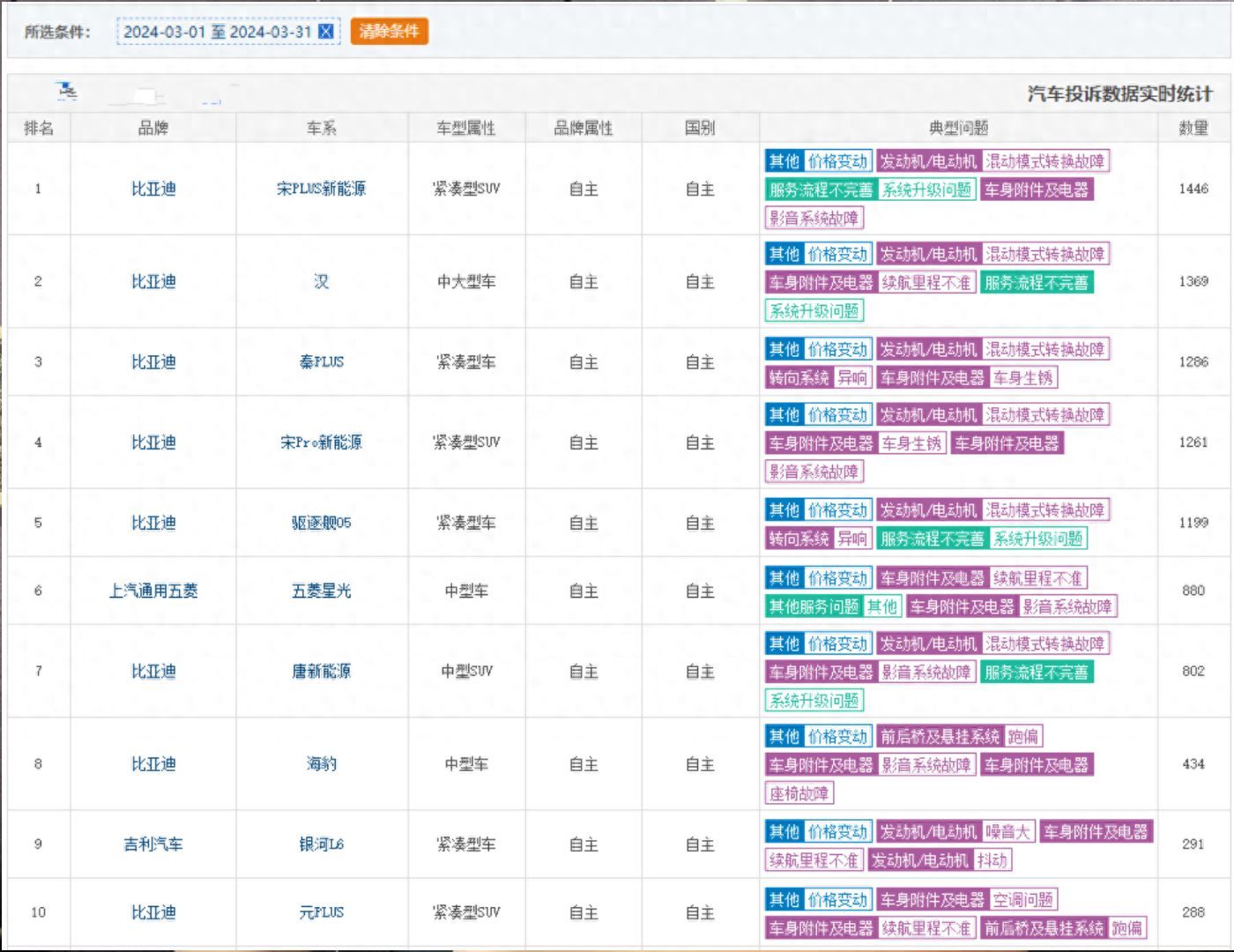 比亚迪8款车中标,几乎霸榜了!上月故障投诉排行榜TOP10名公布!