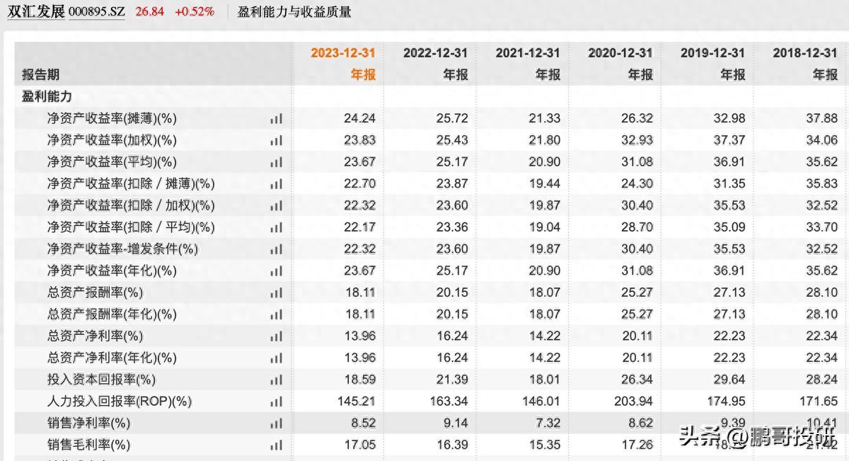 双汇发展是国内火腿肠龙头股,业绩非常优秀,从盈利能力来说,双汇发展的ROE高达25%以上,公司的销售净利率高达8%以上,资产负债率在40%以内。