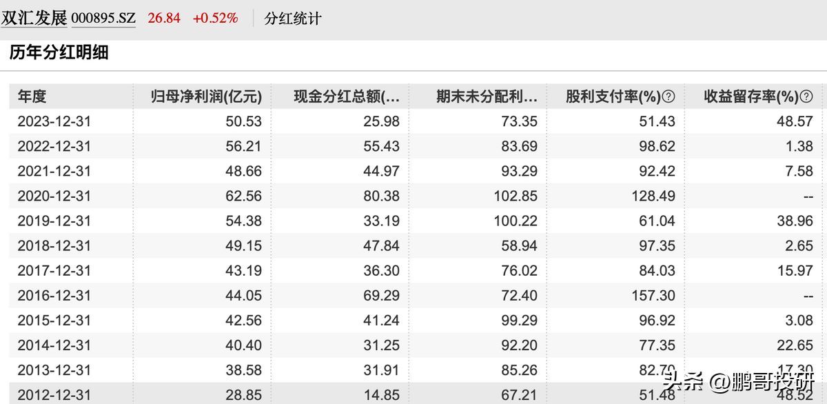 分红上,公司也是很慷慨,2023年公司的净利润是51亿元,现金分红总额26亿元,股利支付率在50%以上,真不错。