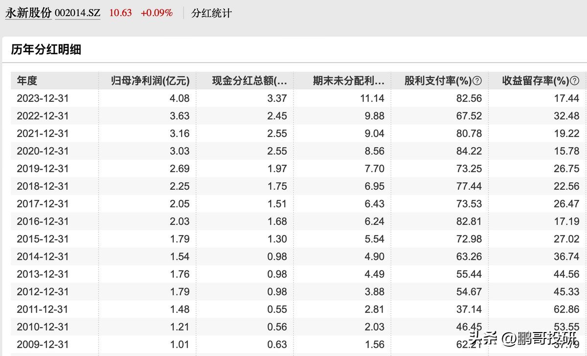 永新股份的分红也是非常稳定,2023年公司的归母净利润是4亿元,现金分红3.37亿元。