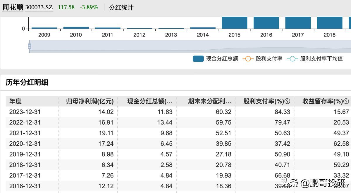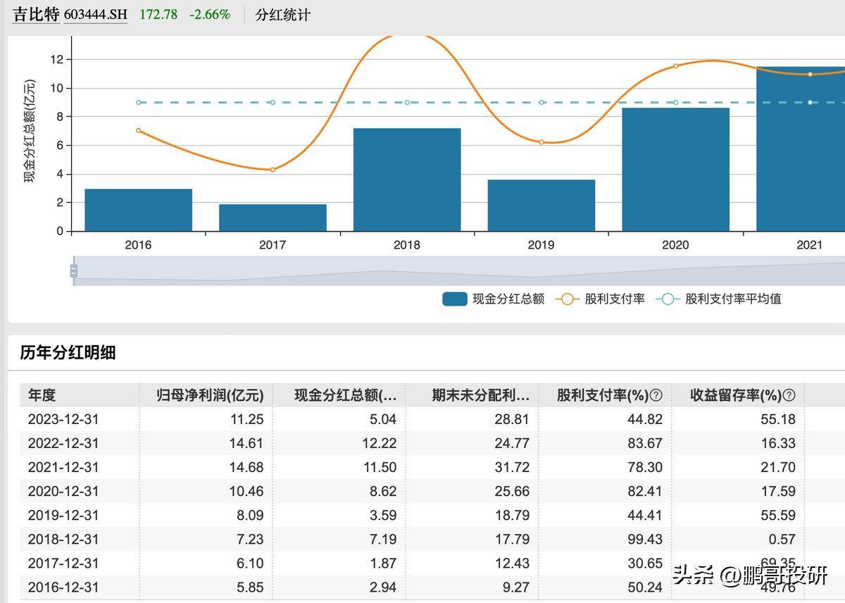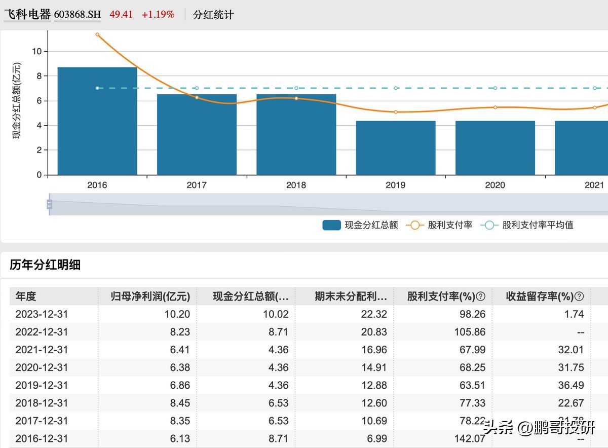 公司的归母净利润是10亿元,现金分红也是10亿,分红超级慷慨。