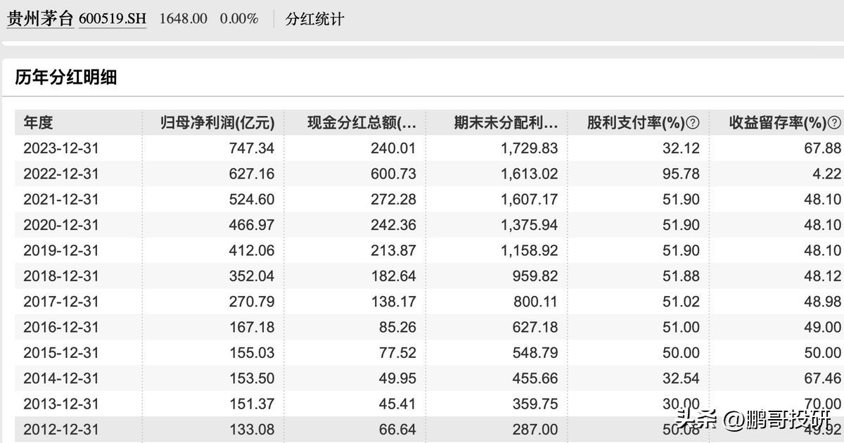 贵州茅台2023年的归母净利润747亿,第一次分红就有240亿。按照历史规律看,公司的股息支付率高达51%。