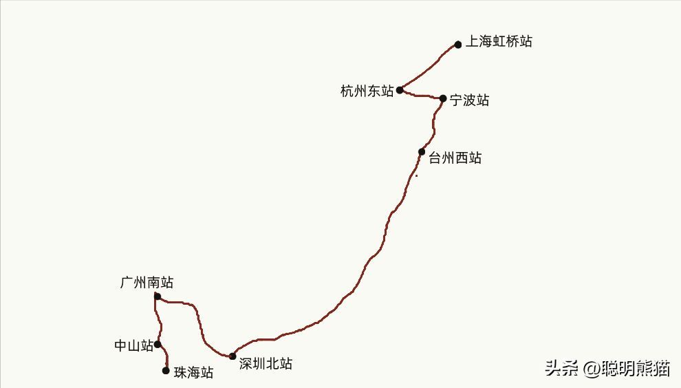 综上所述,本次列车全程运行1841千米,用时12小时30分,平均速度147.2820千米/小时。如果减去列车停靠车站49分钟,列车平均速度约157.5720千米/小时,列车途经上海市、浙江省、福建省、广东省等三省一直辖市,列车停靠上海虹桥站、杭州东站、宁波站、台州西站、深圳北站、广州南站、中山站、珠海站等八座车站
