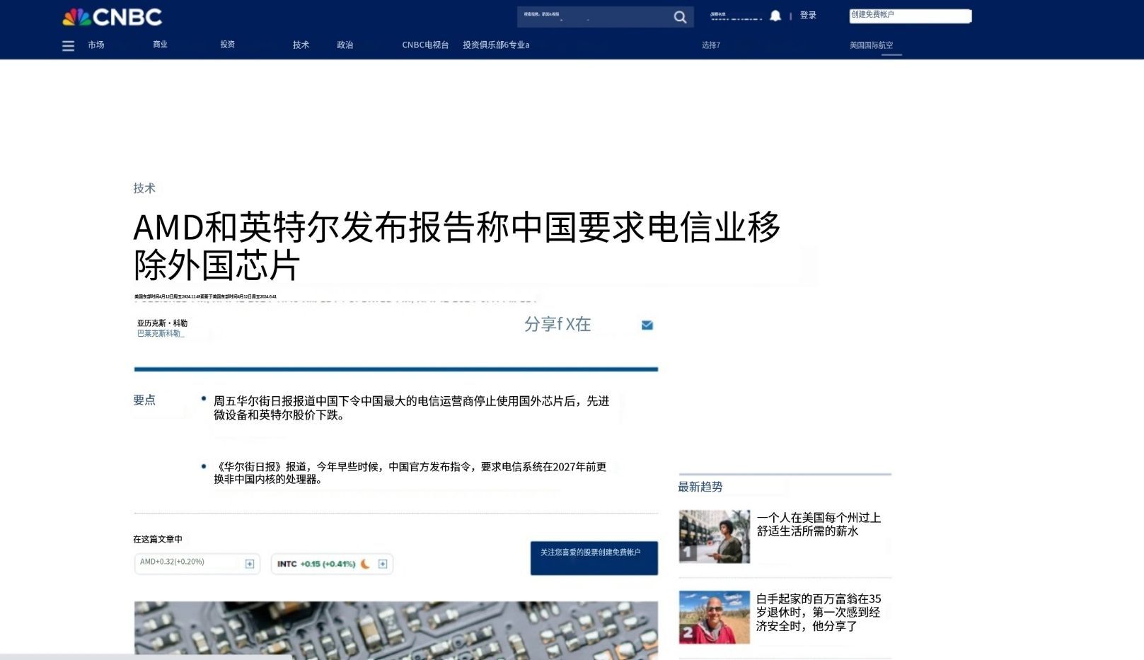 AMD, Intel dip on report China told telecoms to remove foreign chips