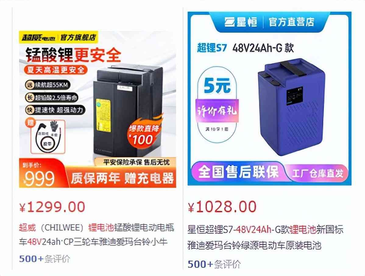那么,一组48V24AH的锂电池价格多少呢?小行家找到2个主流的品牌,分别是超威的锰酸锂电池999元,星恒的超锂S7价格为1028元。可以看出,48V24Ah钠电池和48V24Ah锂电池的价格相差400~500元左右。