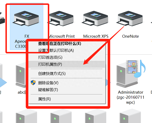 3.选择我们要共享的打印机,并右键打印机属性。