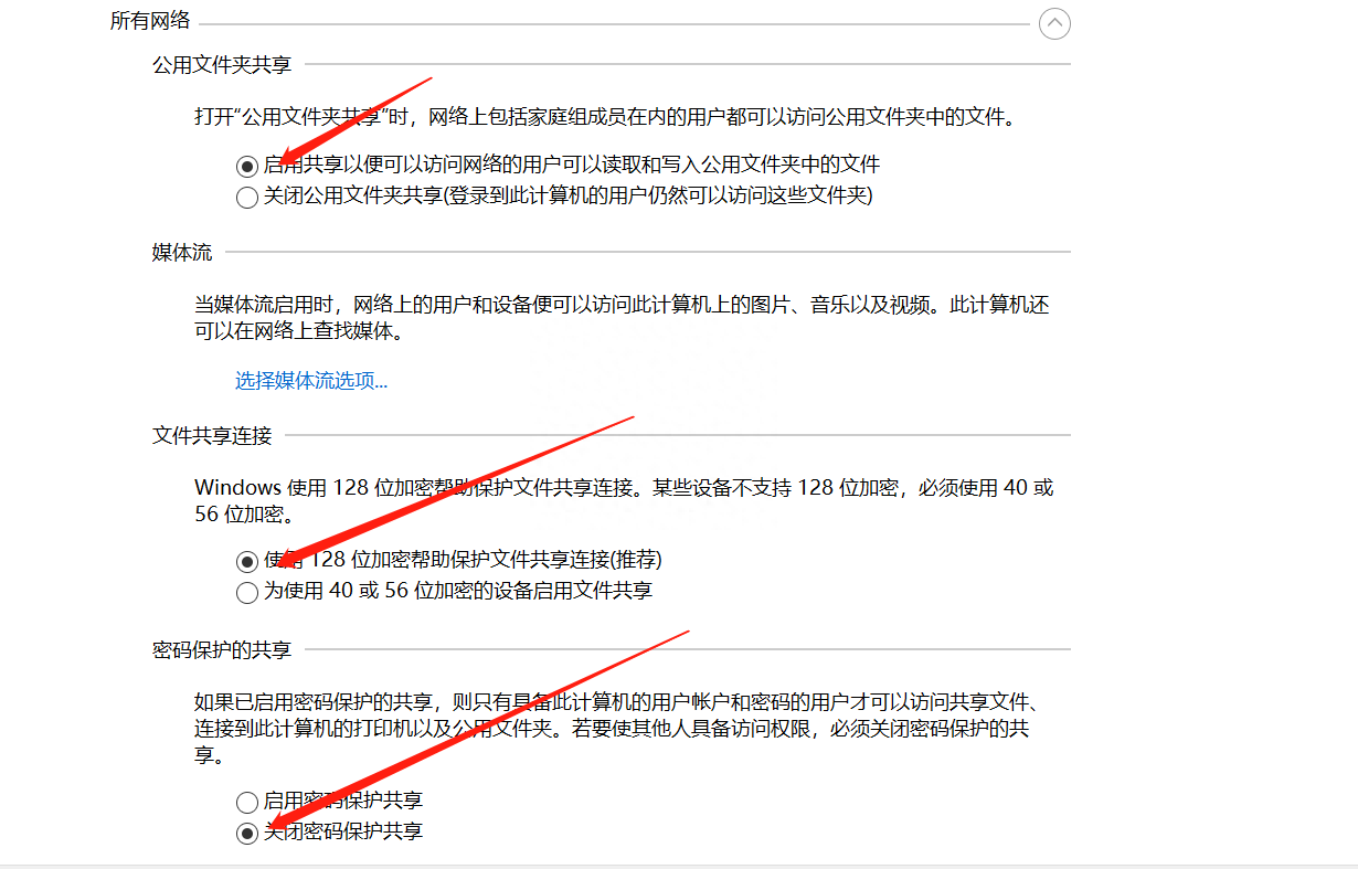 5.点开第4步共享下面的网络和共享中心,选择网络设置,按下图来勾共享设置选项。