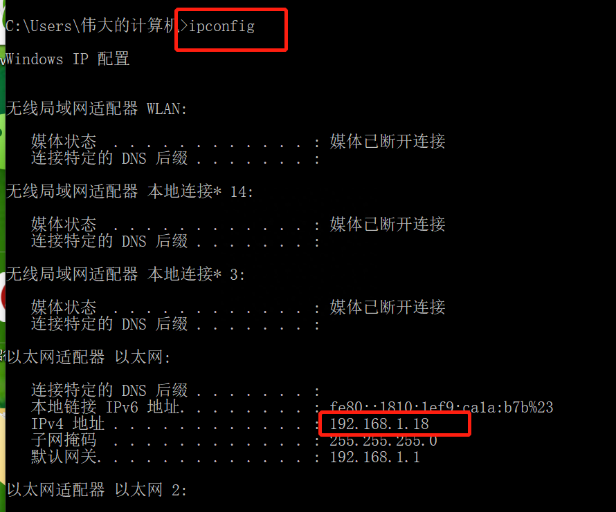 7.在黑色的运行对话框中输入ipconfig,记下你的电脑ip。位置在IPV
