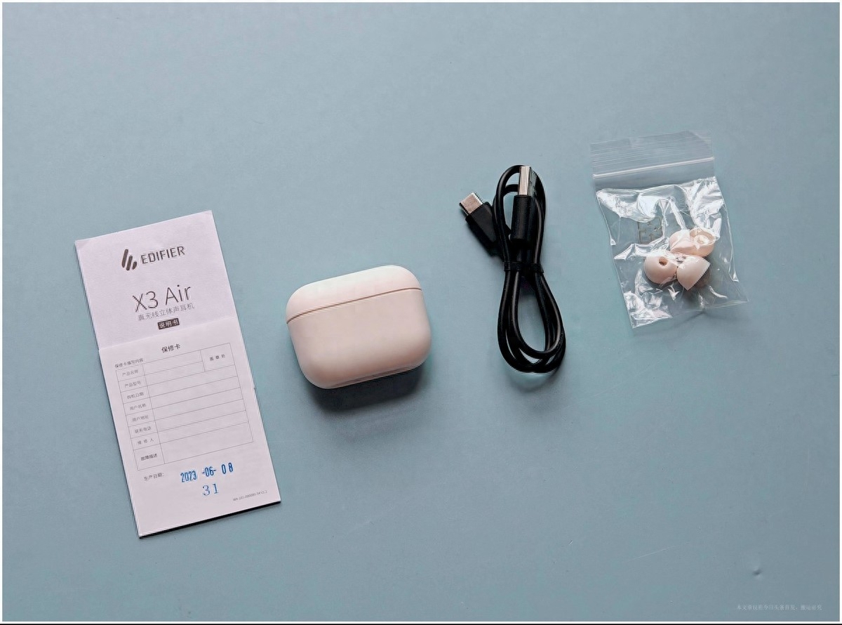 蓝牙耳机的使用体验除了舒适度外,配件也起着至关重要的作用。漫步者在X3Air的包装盒中提供了丰富的配件,包括耳机本体、充电仓、Type-C充电线、耳套以及说明书/保修卡等。这些配件的存在,进一步增强了用户使用耳机的便捷性和多样性。