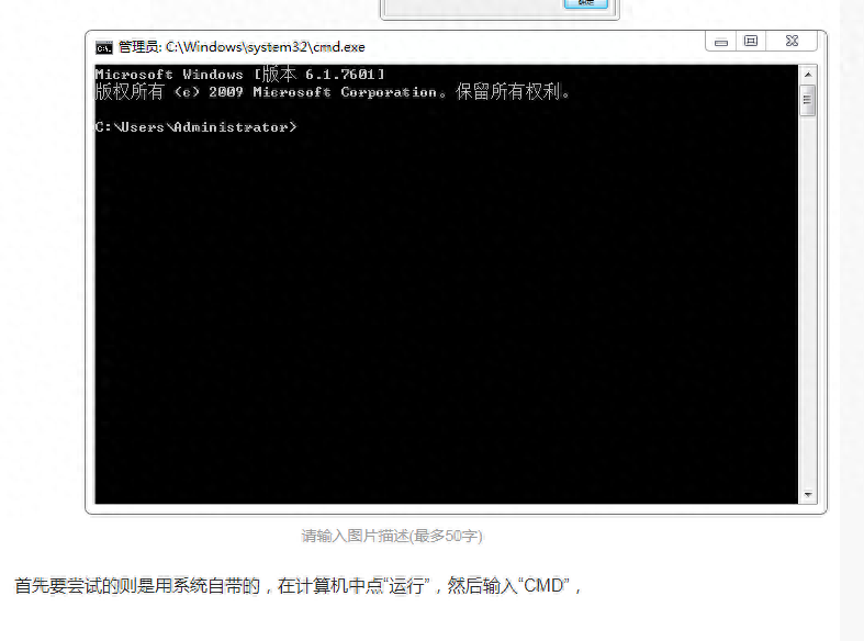 首先要尝试用系统自带的修复功能,在计算机中点“运行”,然后输入“CMD”,弹出下图:
