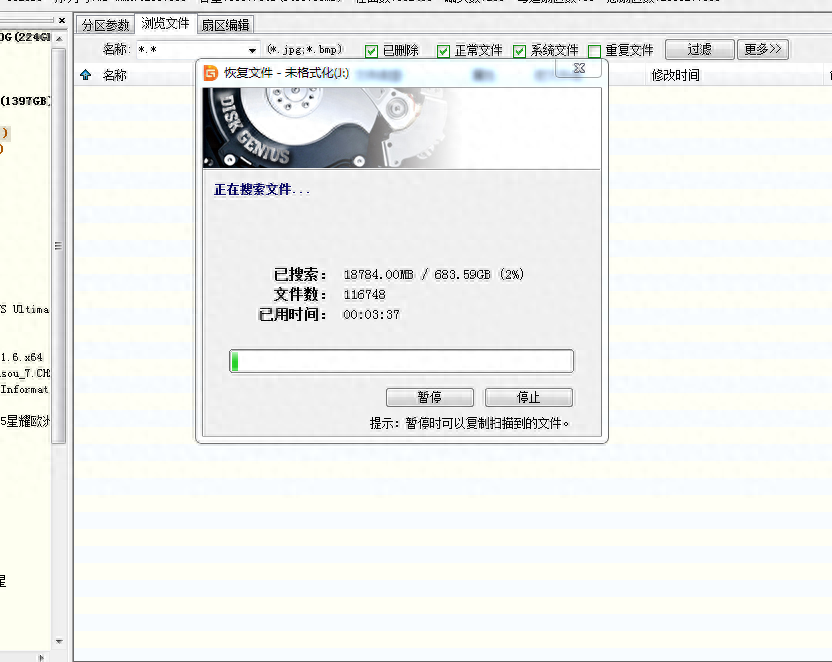 这时可以便做其它的事情,只是恢复问题硬盘文件时,不要去打开正在恢复的文件。