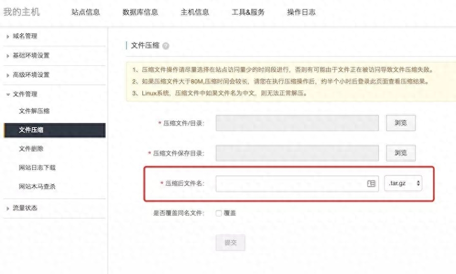 2. 如果是阿里云虚拟主机,进入CP控制面板,在文件管理里压缩站点文件,打包成一个文件,用FTP软件,把备份压缩包下载到本地,备用。