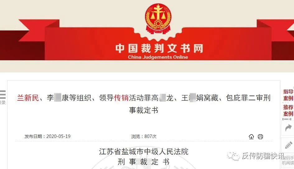 5月25日反传防骗快讯获悉,5月6日,“亚元文旅资产”特大网络传销案在江苏省盐城市中级人民法院二审宣判。一审期间,原审法院以组织、领导传销活动罪、窝藏罪,分别判处兰新民等七名被告人有期徒刑八年半到缓刑二年不等的刑期,并处三百万元到十万元不等的罚金。