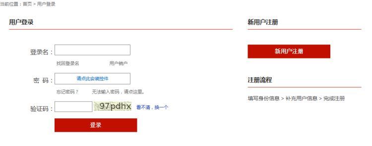第三步:未注册过的新用户点击“新用户注册”,按照流程填写身份信息-补充用户信息-完成注册即可登陆。已经注册过的用户可以填写登录名、密码和验证码直接登陆。