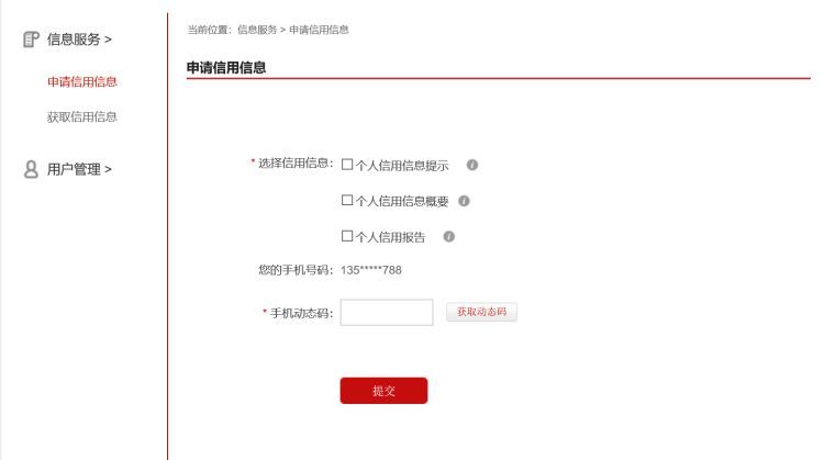 第四步:登录成功后选择信息服务-申请信用信息,有三项信用信息可以选择,包括个人信用信息提示、个人信用信息概要和个人信用报告。根据自身需要勾选需要的信息,并填写手机动态码后提交。