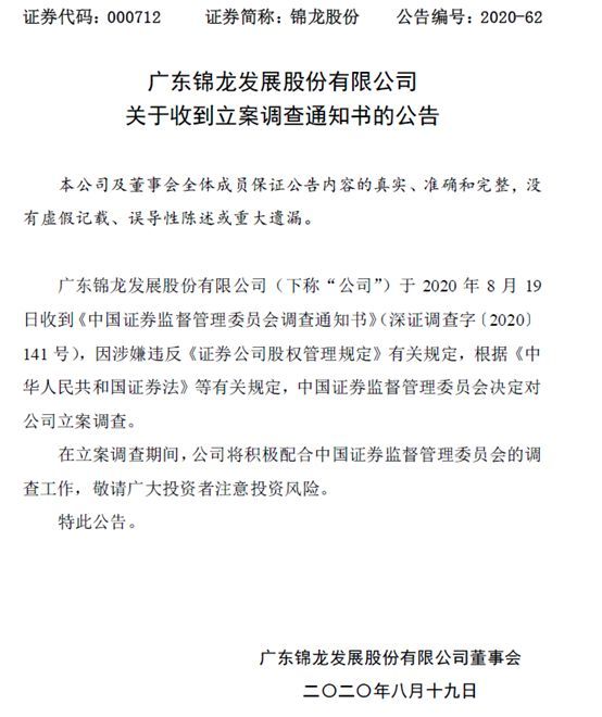 锦龙股份8月19日晚公告称,公司于2020年8月19日收到《中国证券监督管理委员会调查通知书》,因涉嫌违反《证券公司股权管理规定》有关规定,根据《中华人民共和国证券法》等有关规定,证监会决定对公司立案调查。
