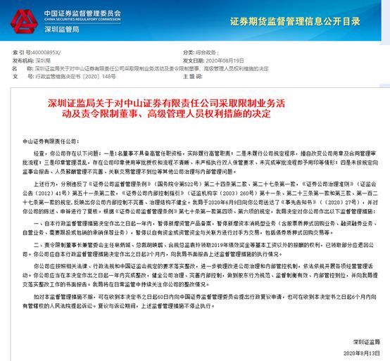 对中山证券来说,同在8月19日,深圳证监局对锦龙股份控股中山证券的多位高管遭认定不适当人选,同时对中山证券董事长、总裁、合规总监进行公开谴责。