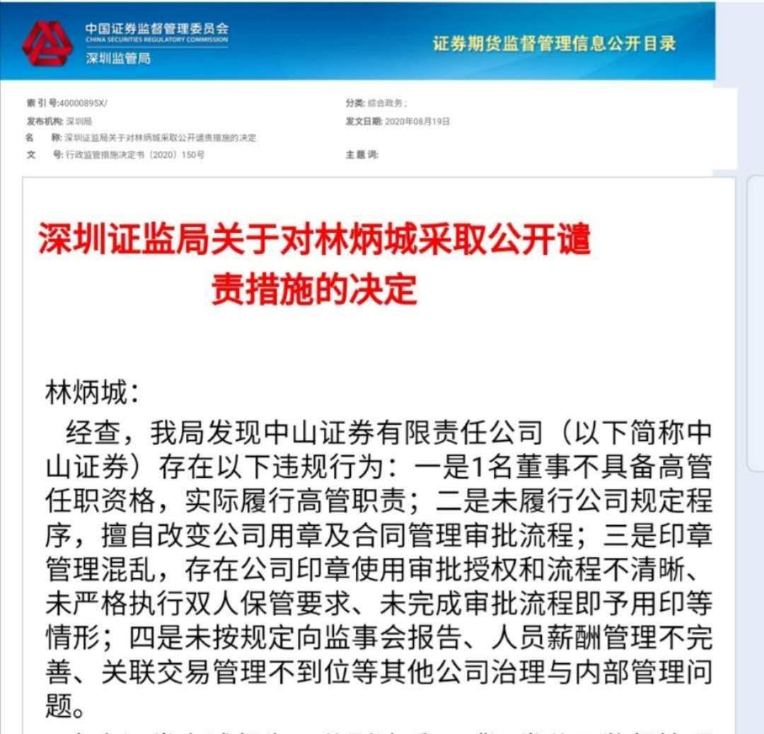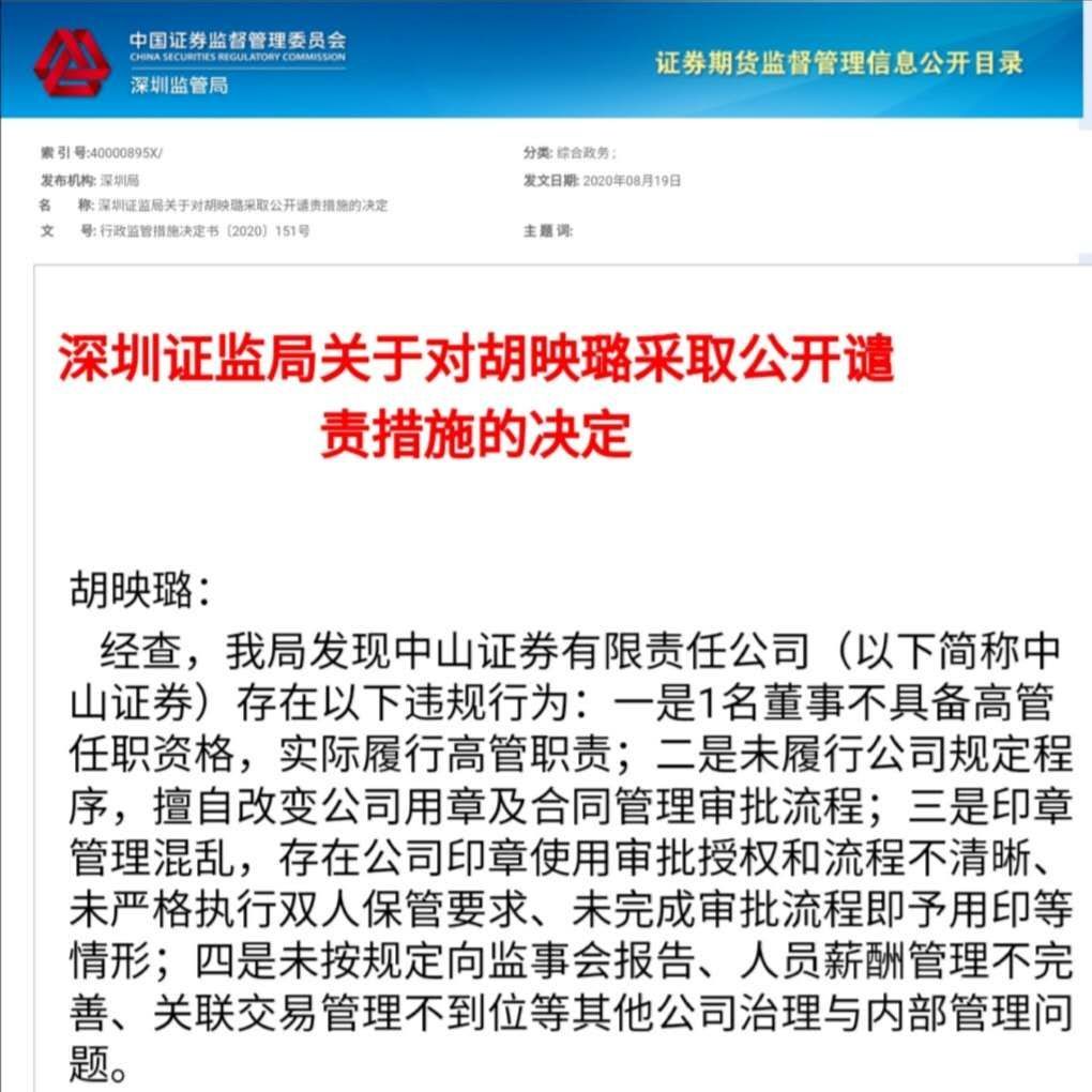 8月19日晚,深圳证监局正式下发了对中山证券董事长林炳成、总裁胡映璐、合规总监袁玲等3人的公开谴责,同时对公司管理委员会副主任孙学斌、公司管委会主任助理黄元华、董秘及时任董事会办公室主任、分管办公室的管委会委员石文燕等3人作出不适当人选措施的认定。