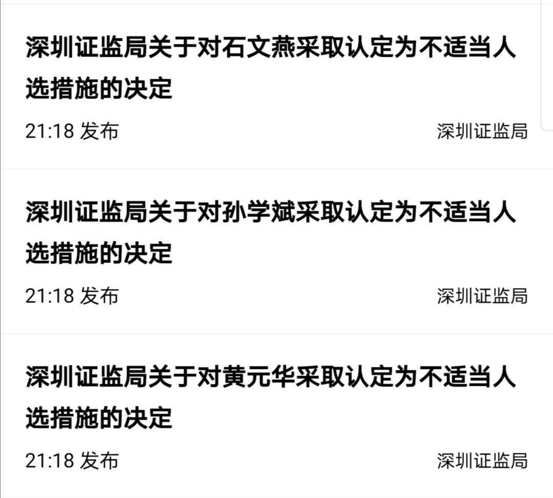 在上一轮处罚中,深圳证监局已拟对孙学斌、黄元华作出认定为不适当人选的监督管理决定。