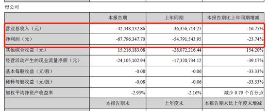 需要指出的是,锦龙股份的母公司在今年上半年营收和净利润均为负值。其中总营收为-4244.81万元,亏损额同比扩大16.75%,净利润为-6779.63万元,亏损同比扩大23.74%。