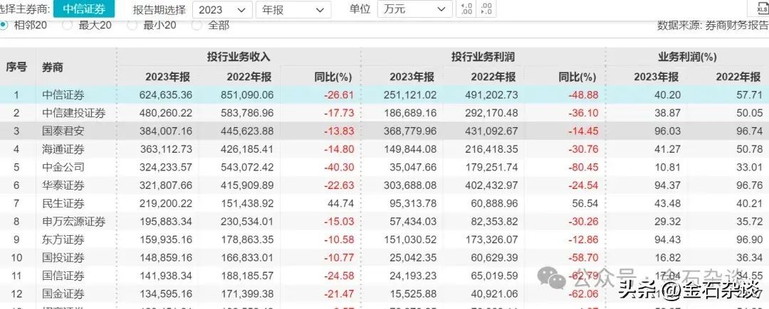 金石杂谈查询发现,2024年一季度,该券商营收、净利均实现双位数下滑,2023年年报显示该券商净利已经下滑了8.3%。2023年,该头部券商投行收入双位数下滑,股权融资交易额同比下降1/3,不过债券承销融资额增长了近20%。