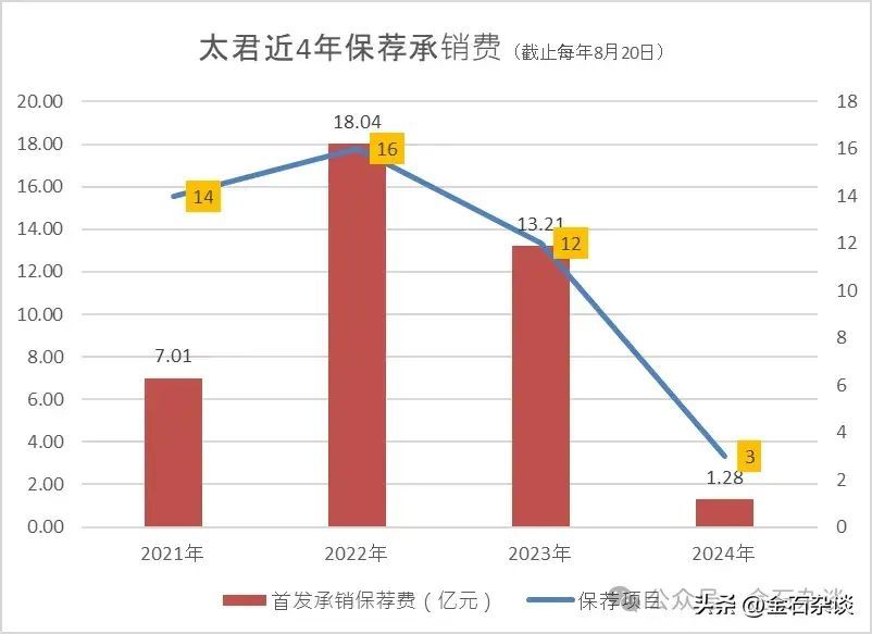 金石杂谈查询发现,太君近4年保荐项目在2022年达到峰值,一年保荐承销费高达18亿,23年下滑至13亿,如今逆周期调节下8个月保荐了3个项目,总承销保荐费1.28亿,相较于50%降薪太君股权承销保荐费少了90%...
