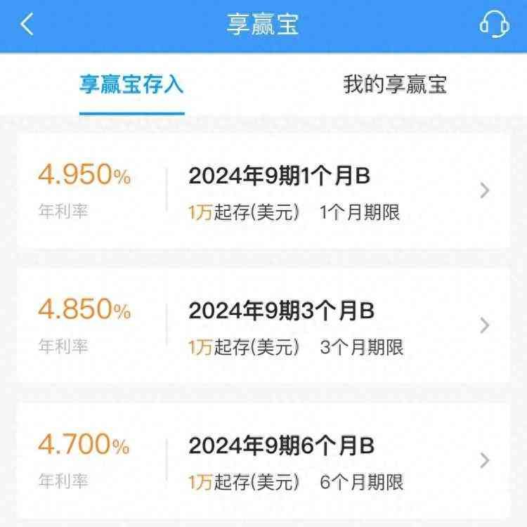 上述江苏银行的工作人员介绍,目前,该行“享赢宝”美元存款产品的利率分为1美元和2美元起存两档,现在最高的是1美元起存一个月的存款产品,年利率是4.95%,一年期年利率是4.6%,半年期年利率是4.7%;2美元起存的,一年期、半年期、三个月、一个月的产品年利率分别是4.4%、4.4 %、4.55%、4.7%。
