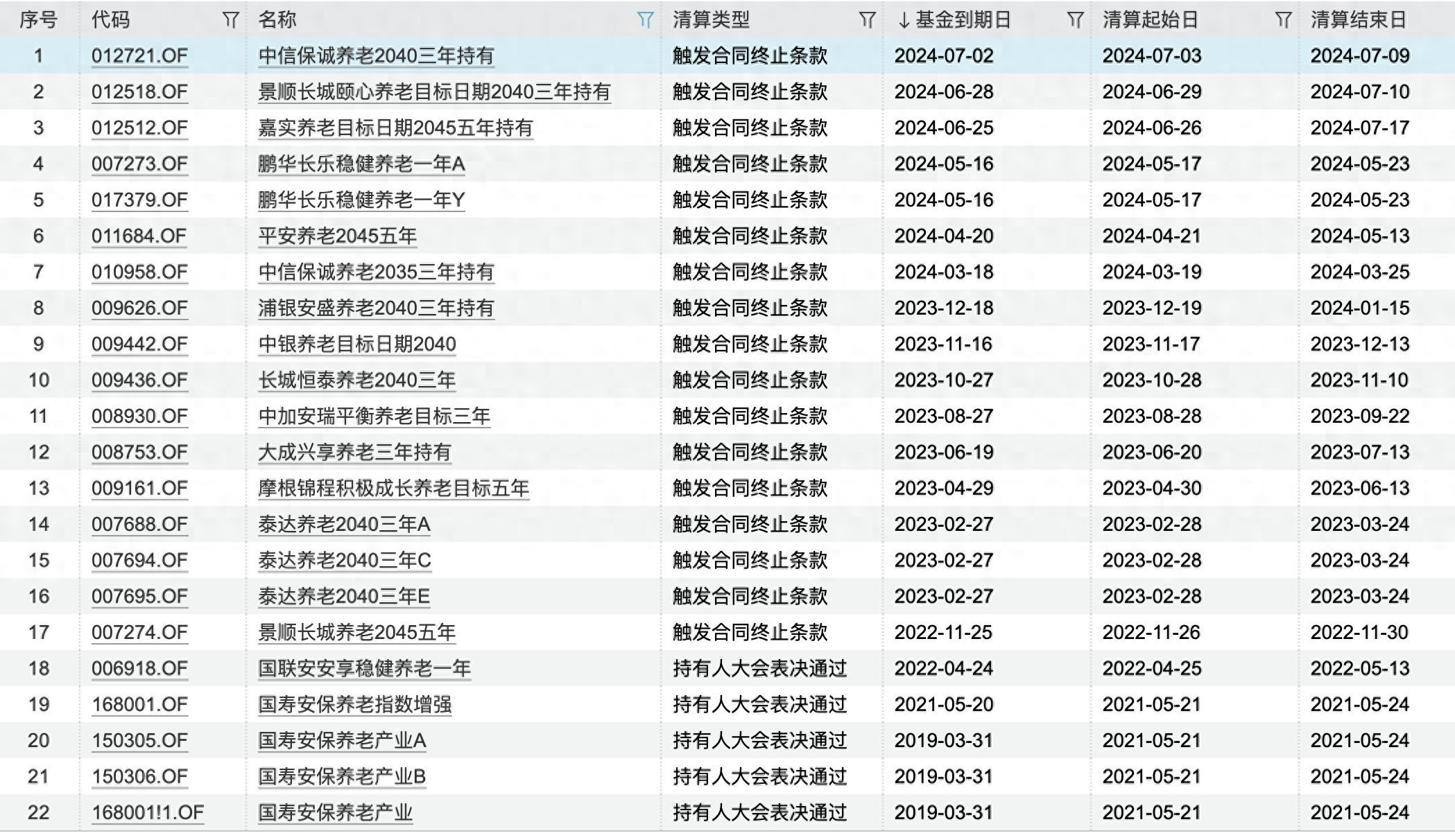 加上此前清盘的摩根锦程积极成长养老目标五年、泰达养老2040三年、景顺长城养老2045五年、国联安安享稳健养老一年、国寿安保养老产业等产品,市场上养老FOF产品的清盘数量已扩至22只。