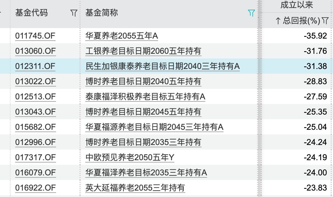 从业绩来看,接近六成产品年初至今的收益率为负,年内平均回报率为-1.18%。2022年底,首批养老Y份额陆续成立,截至今年6月30日,仅23%的养老Y份额基金取得正收益,平均年化收益-3.23%。其中,华夏福源养老目标日期2045三年持有Y、工银养老目标日期2060五年持有、民生加银康泰养老目标日期2040三年持有A等多只基金自成立以来亏损幅度超30%。