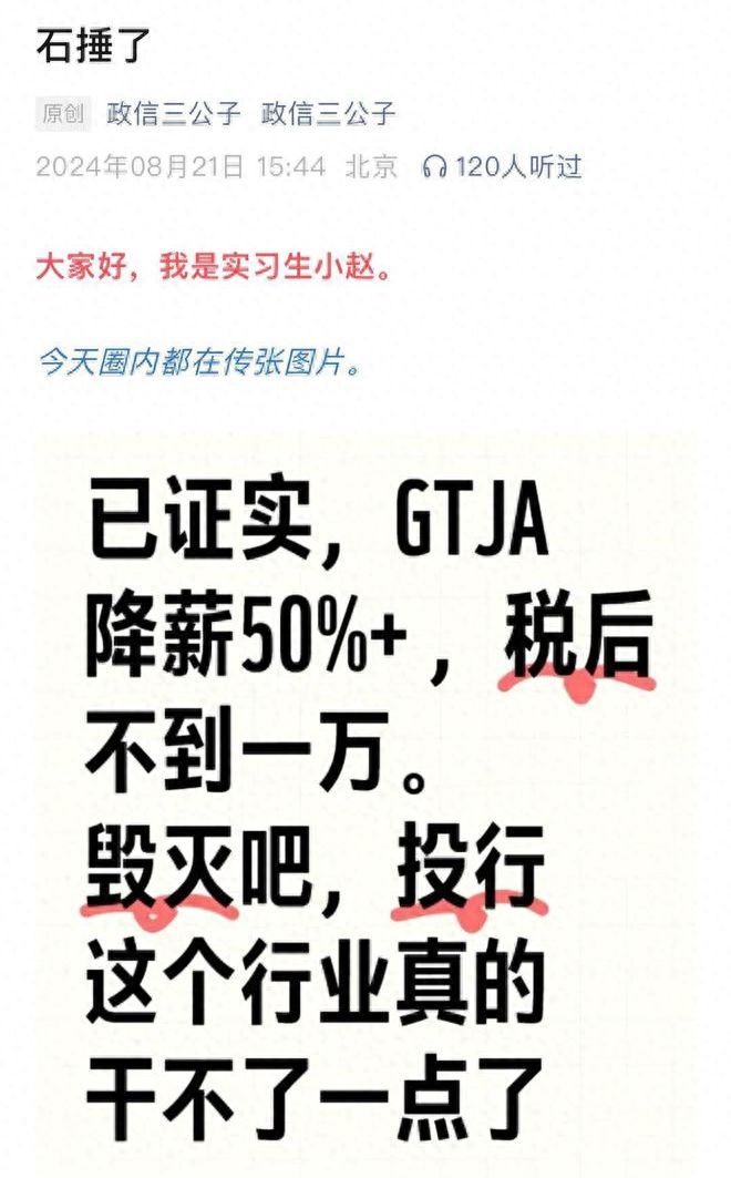 网友:已证实,GTJA降薪50%+ 税后不到一万 投行干不了一点了…