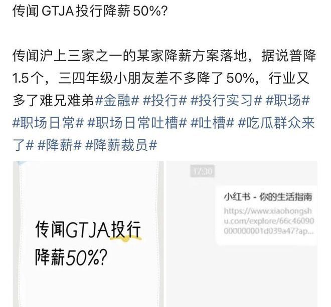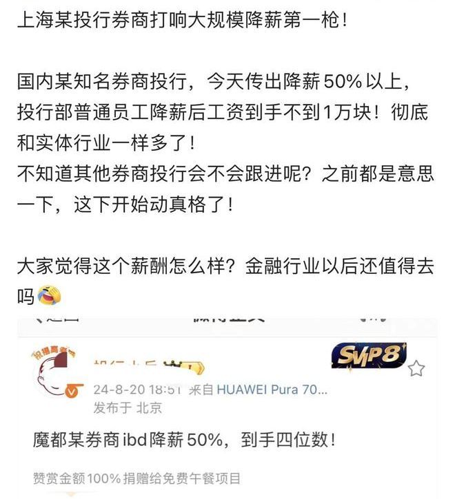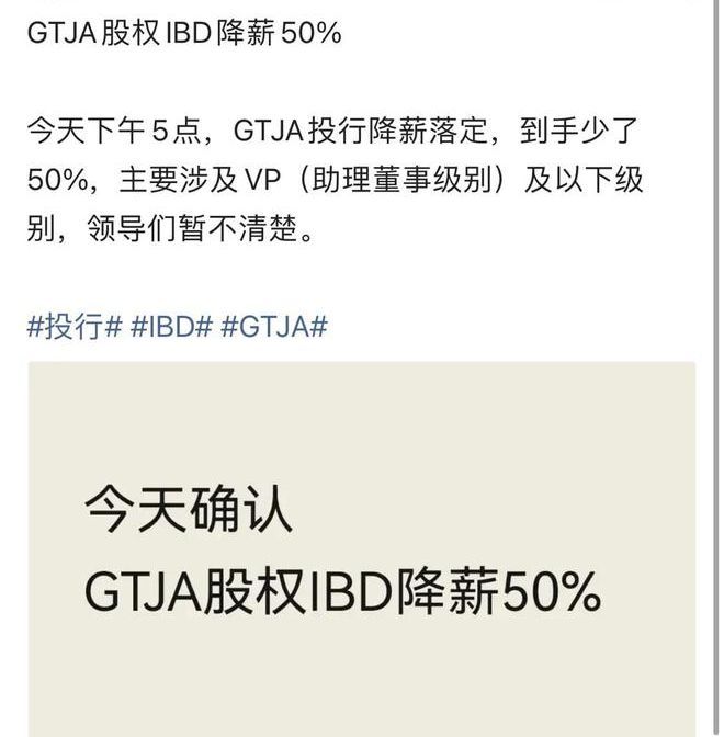 结果呢,这才一个月光景,风暴就升级成了海啸!网上疯传,GTJA这类国内响当当的券商投行,降薪幅度直接飙到了五成以上,普通员工到手的钱,跟实体行业的小哥小妹们差不多了,一万块都不到,那叫一个惨烈啊!大家心里都犯嘀咕,这不会是连锁反应吧?其他投行会不会也跟上这股“狠劲儿”?