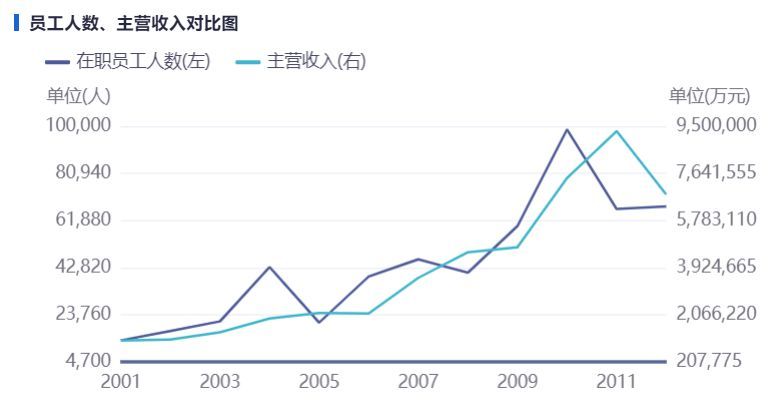 从上图就能看到,美的从28年到2010年员工人数就涨了一倍还要多。